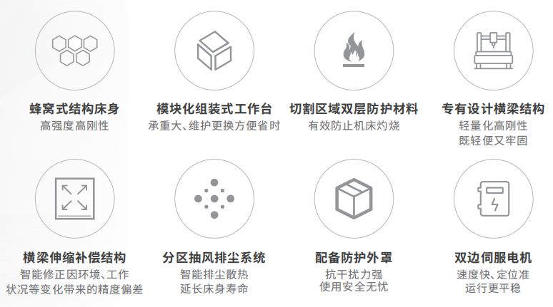 4. 具備掃碼導圖、圖形自動優(yōu)化、高速尋邊、自動調焦、測焦、閃電穿孔、穿孔除渣、蛙跳切割、飛行切割、空移避讓、氣體沖刷、起刀收刀工藝、斷點續(xù)切、氣壓閉環(huán)、吹氣保護、高速尋邊、振動抑制自適應等功能,還可根據需求配備視覺余料再生產、自動更換噴嘴、平面坡口等高階功能。