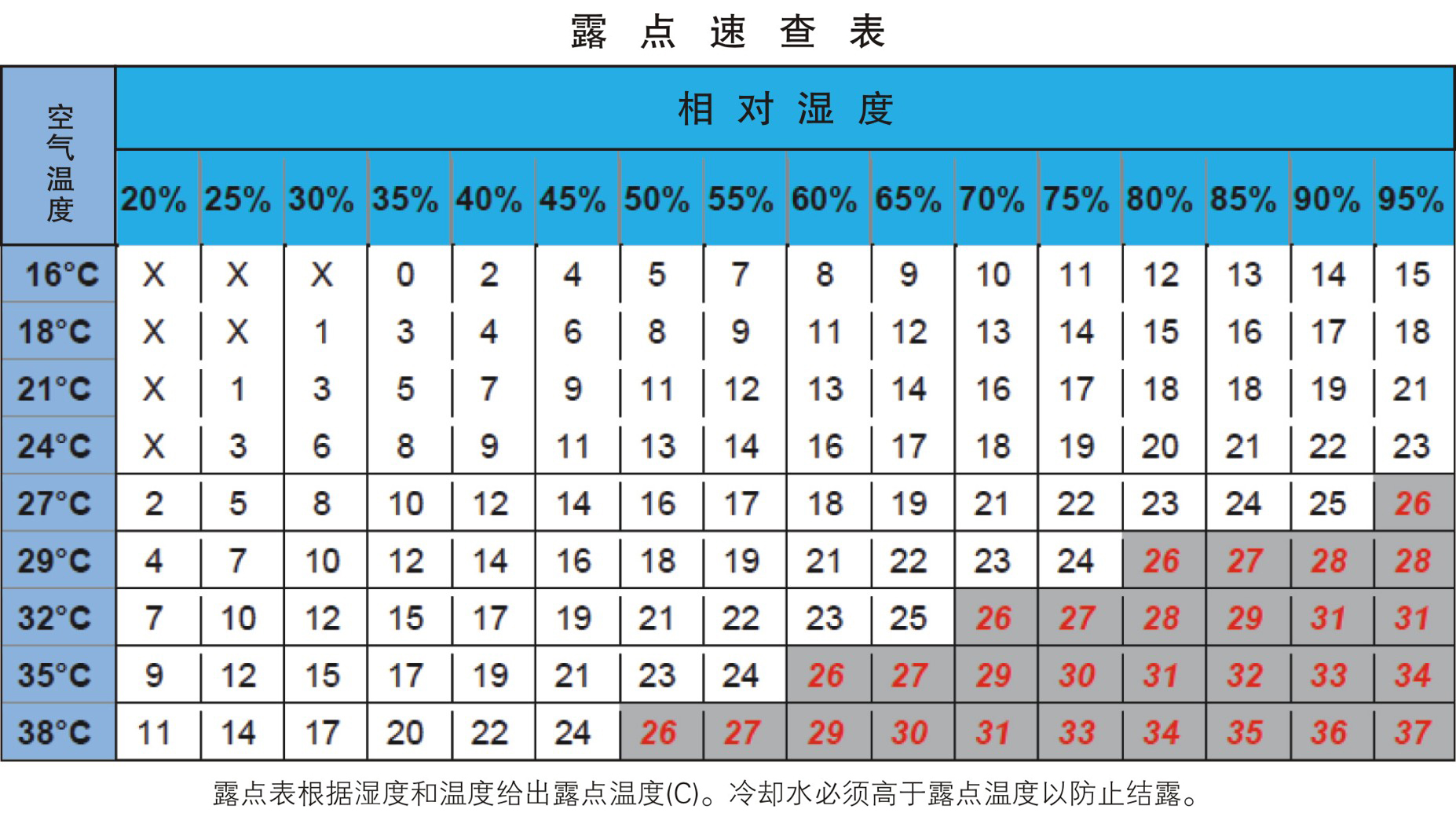 2、針對(duì) 2500W 以上的激光器,去離子 DI 水(冷卻光學(xué)件)的水溫應(yīng)該設(shè)定在 27 度到 33 度之間,這個(gè)溫度應(yīng)根據(jù)環(huán)境溫度和濕度做相應(yīng)的調(diào)整,通常說來環(huán)境溫度越高,濕度越大,DI 水的水溫應(yīng)該相應(yīng)增加。其基本原則是 DI 水水溫應(yīng)該在結(jié)露點(diǎn)以上。結(jié)露點(diǎn)表如下: