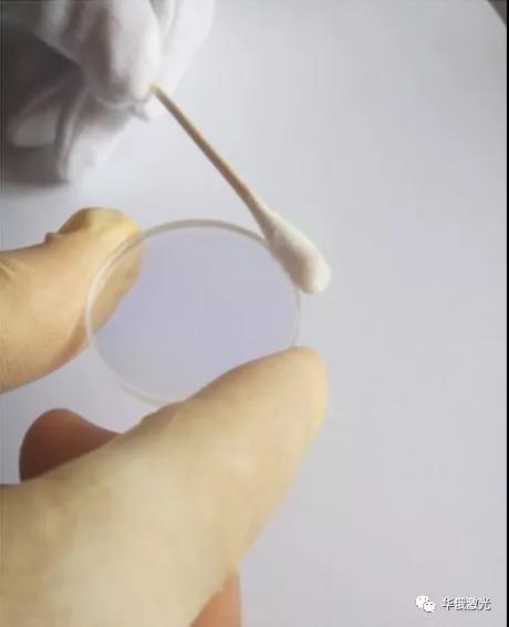 4.用丙酮浸濕絨頭棉簽,用它清潔鏡片表面,以去除在清潔過程中殘留的所有無水乙醇和拋光液殘留物。當用丙酮進行最后的清潔工作時,請在鏡片表面輕輕拖動棉簽,拭去原先留下的痕跡,直到整個表面都被擦拭干凈為止。再用棉簽做出最后一個擦拭動作,應慢慢移動,以確保棉簽后面的表面能立即變干,這可消除表面的條痕。某些類型的污染或損壞(如金屬飛濺物,坑洞等)是無法去除的。如果鏡片表面有上述污染或損壞,且無法清潔還原,應放棄清潔,更換為新鏡片,以保證切割質量。